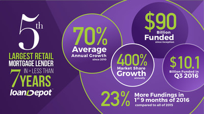 loanDepot's year-to-date funding volume for the first three quarters of 2016 reached $27 billion, a 23 percent increase compared to the same period in 2015, and three times the funding volume for the entire year of 2013. As the youngest brand among today's top five retail mortgage lenders, loanDepot has funded more than $90 billion in home, personal and home equity loans since inception.