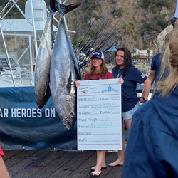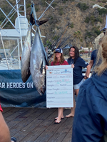 Brown and Peterson, both Purple Heart recipients, each caught a qualifying bluefin tuna over 50 pounds, enabling them to be a part of the post-tournament fish weigh-in experience held on Avalon's iconic Green Pleasure Pier. There, as one of the 12 teams that brought qualifying fish to the pier, they were cheered on by tourists, Avalon locals and fellow WHOW tournament teams, as they watched their fish be weighed and documented. Brown's weighed in at 156 lbs., Peterson's weighed 101 lbs. Their catches earned them sixth and seventh place, respectively, in total overall tournament points.